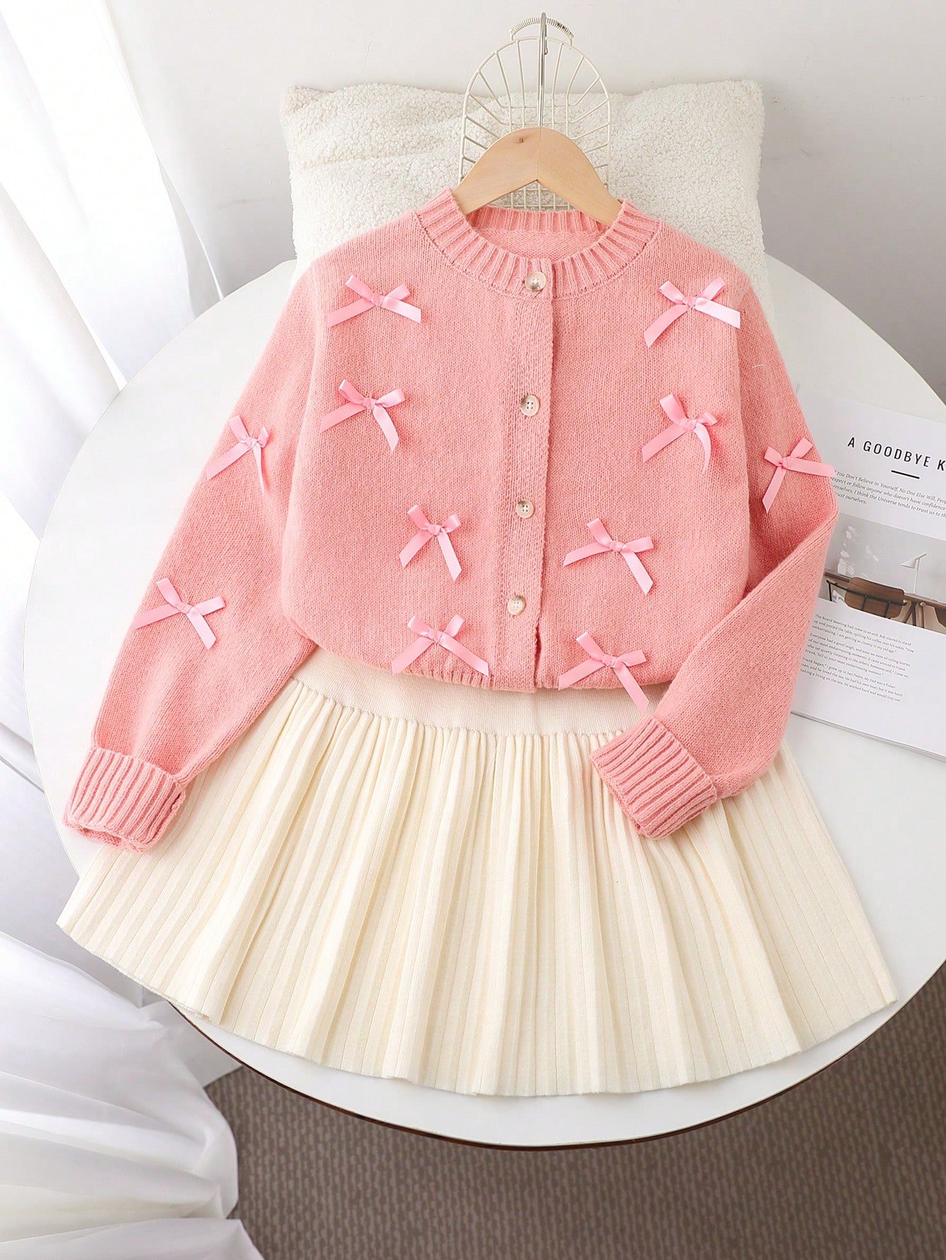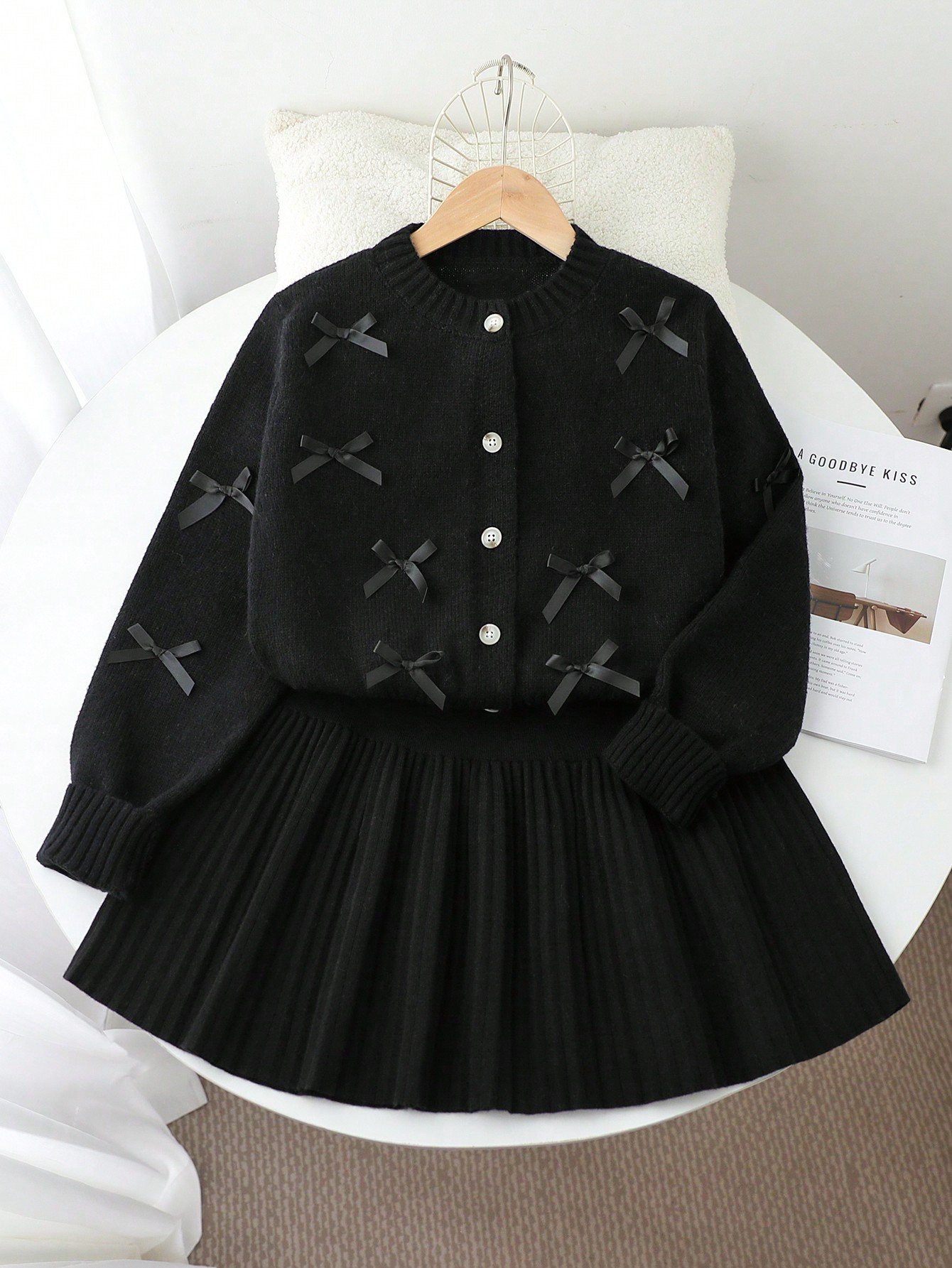 2pcs/Set Tween Girl Winter Outfit, Elegant Bow Decor Sweater And Knitted Pleated Skirt Set