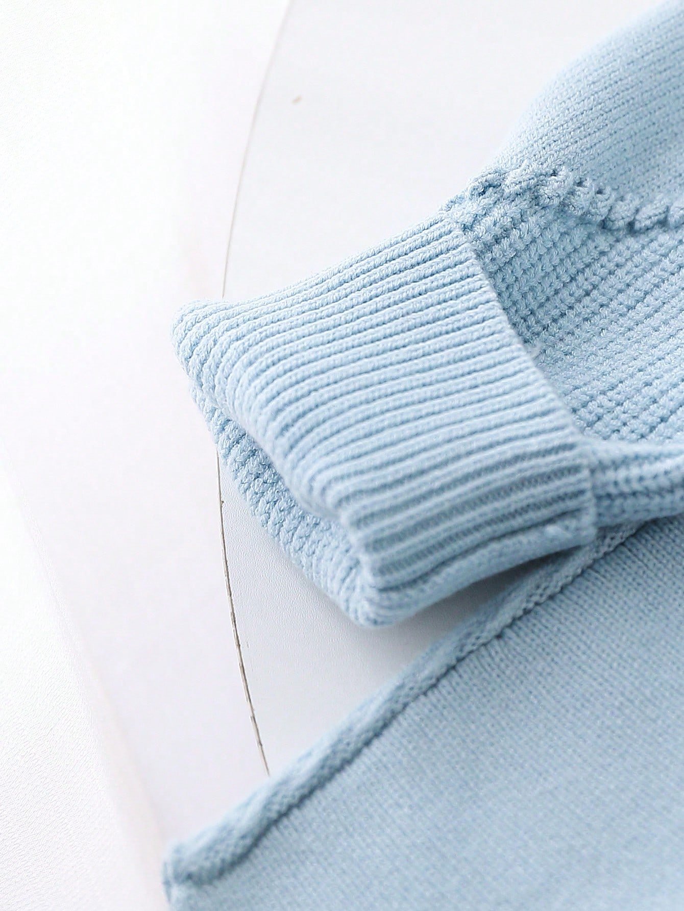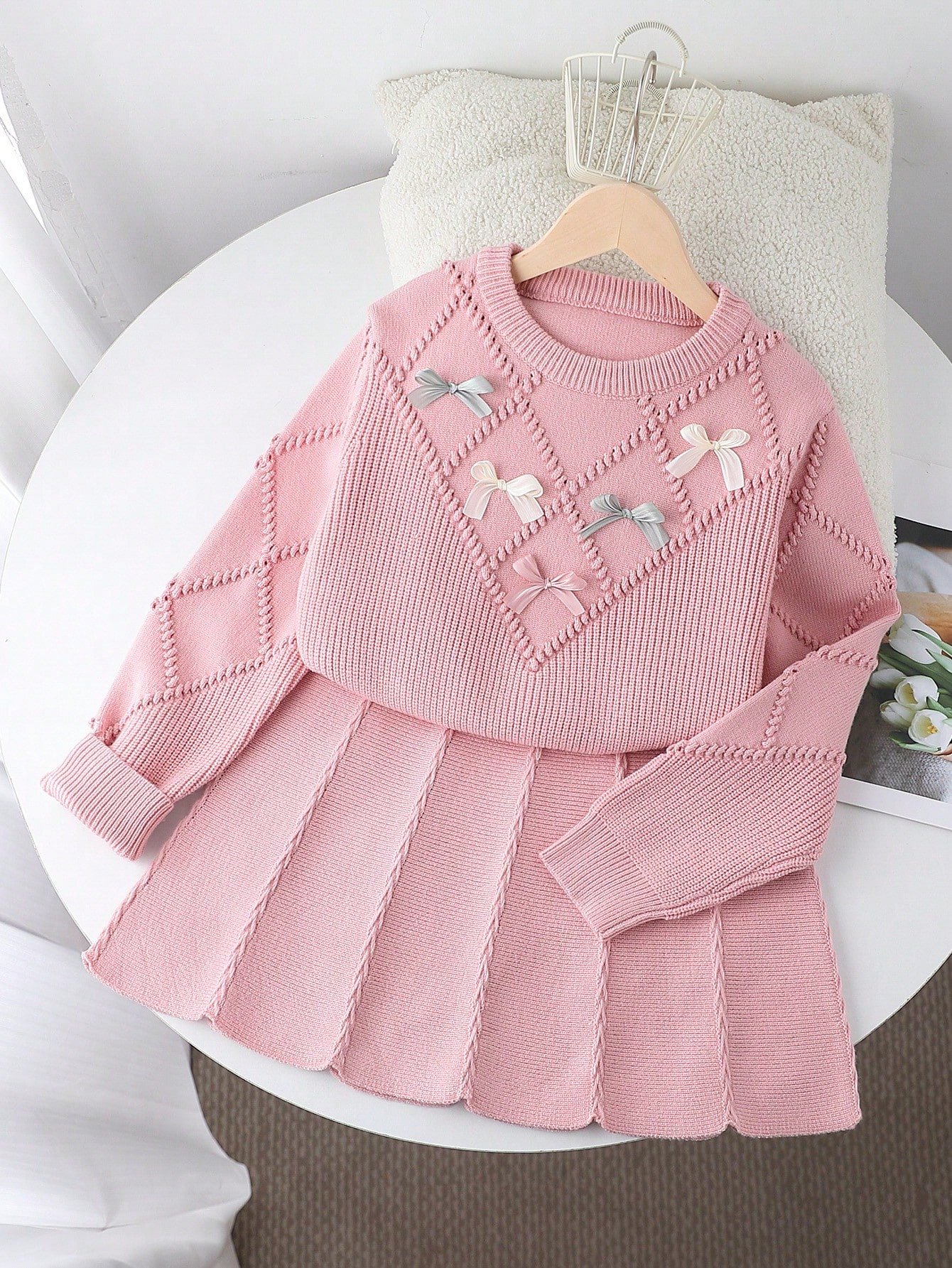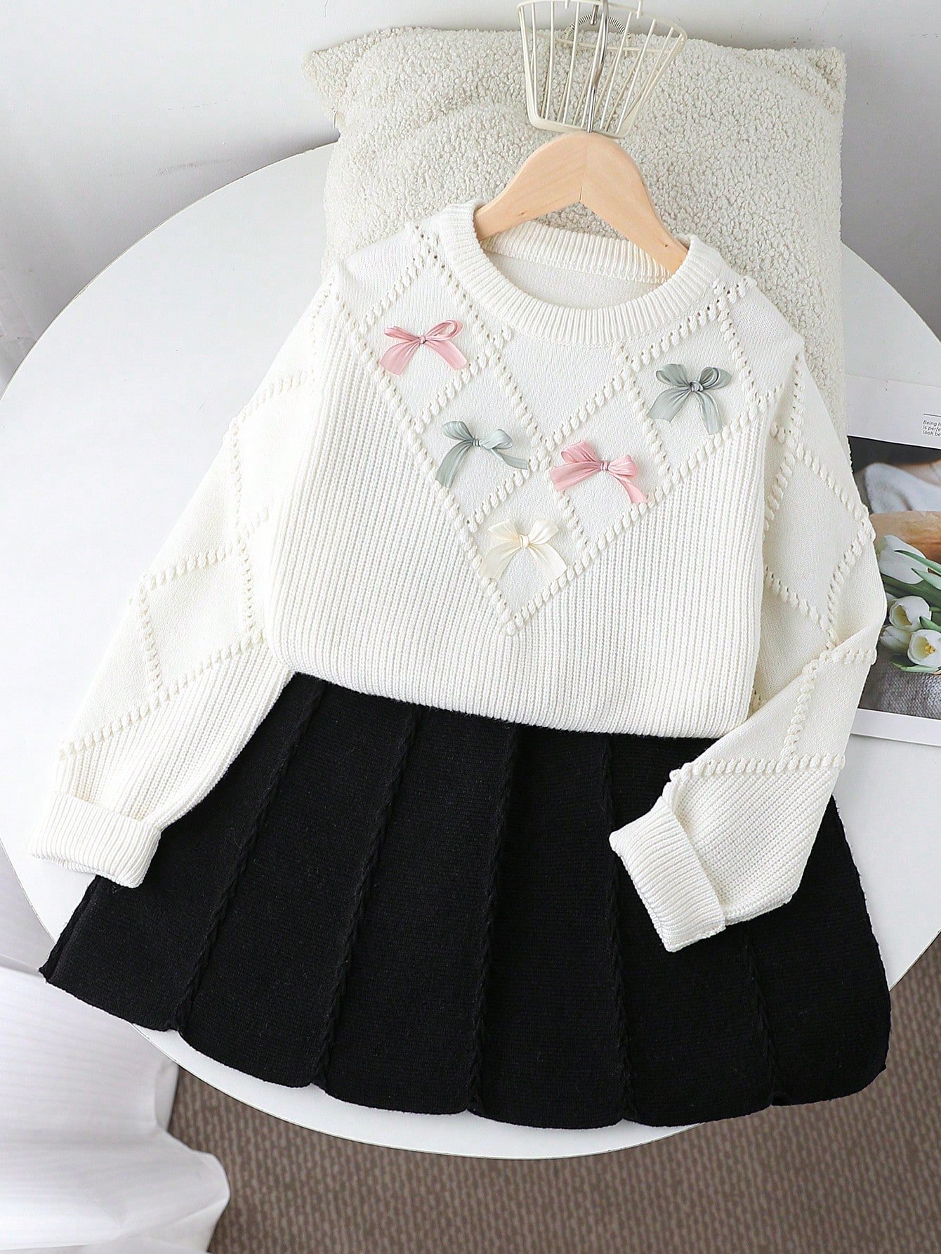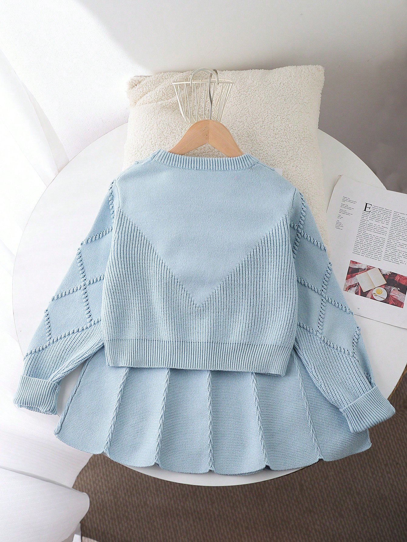 2pcs/Set Tween Girls Winter Knit Sets, Cute Bow Accent Blue Sweater And Knit Skirt