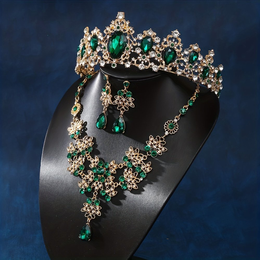 Baroque Crystal Bridal Jewelry Set Vintage Golden Green Rhinestone Wedding