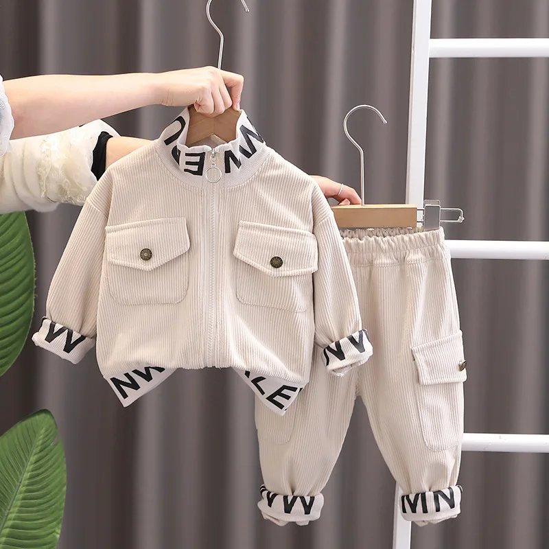 Childrens Clothing 2024 New Baby Spring Clothes for Kids Boys and Girls Letter Standing Collar Corduroy Jackets Pants Outfit Set