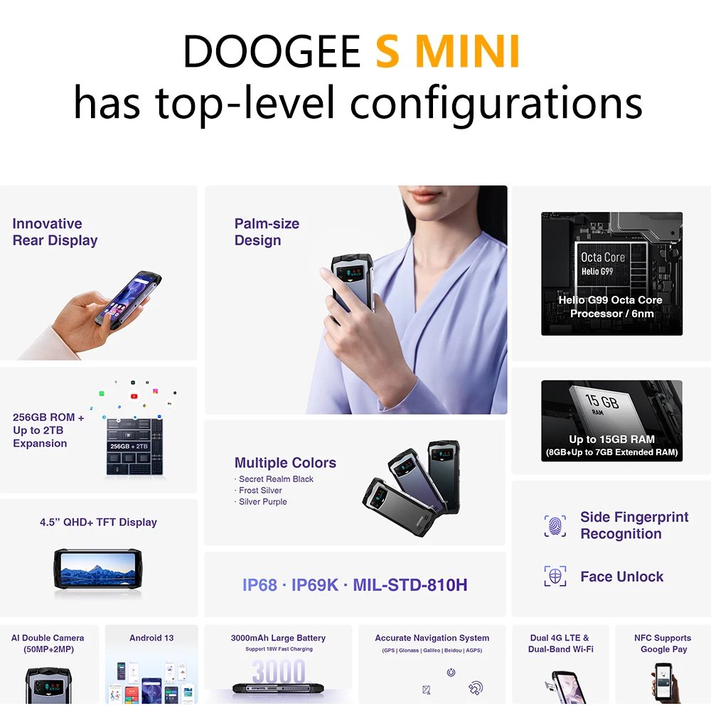 DOOGEE Smini Rugged Phone 4.5″QHD Display Helio G99 4G 50MP Camera 3000mAh