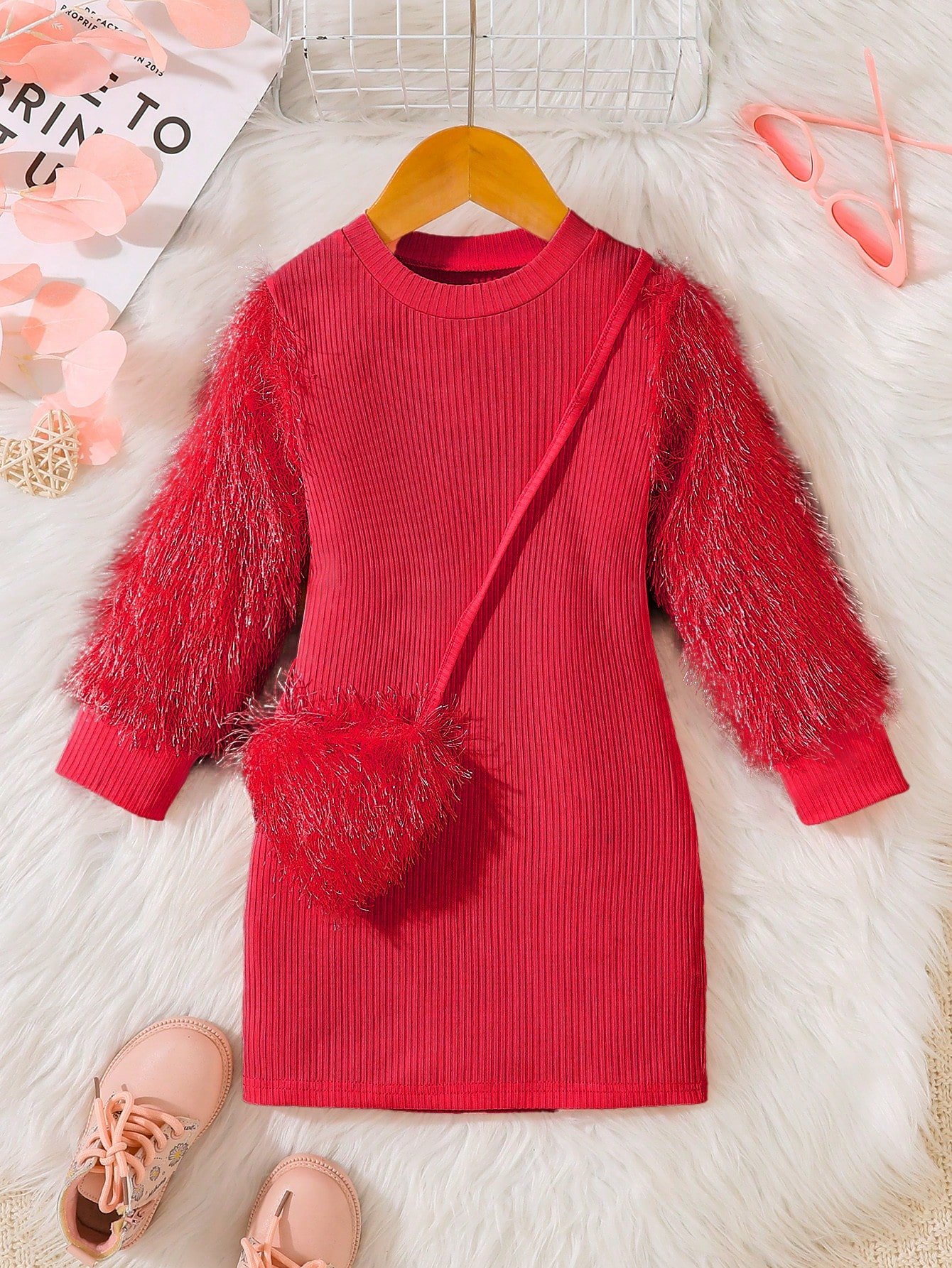 Fashionable Young Girls' Pink Elegant Ruffle Sleeve Heart Decor Cinched Waist Dress, Suitable For Parties, Holidays, Outings And Daily Wear, Spring & Autumn