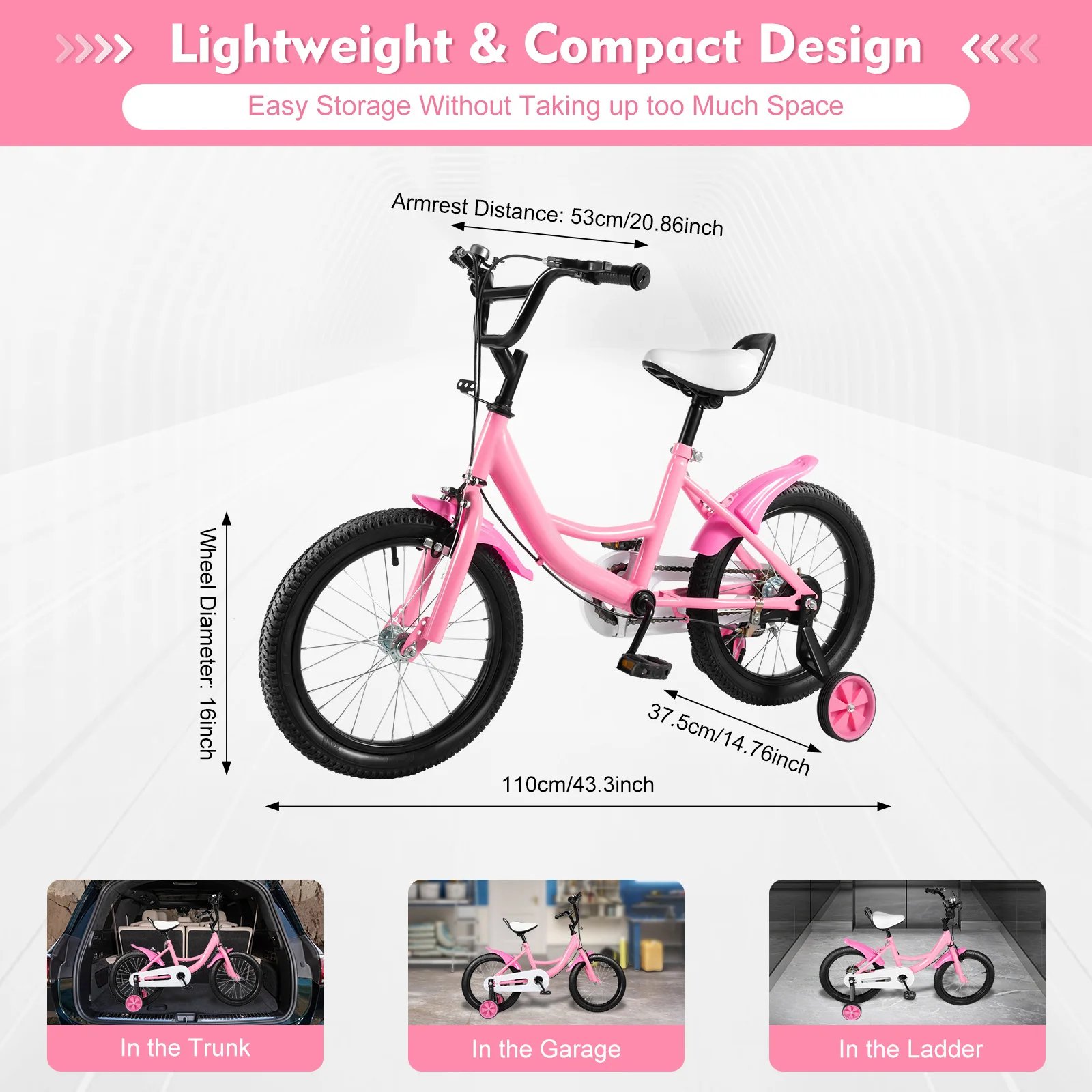 Kids Bike, 16&quote; Girls Pink Bicycle Cycling Removable Stabilisers W/ Anti-Slip Armrest & Reliable Braking System