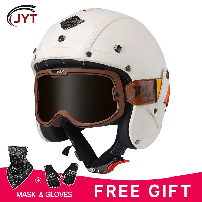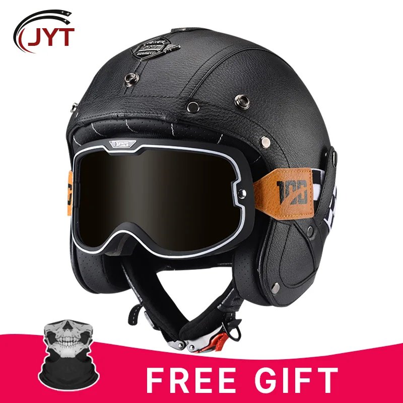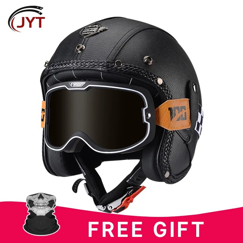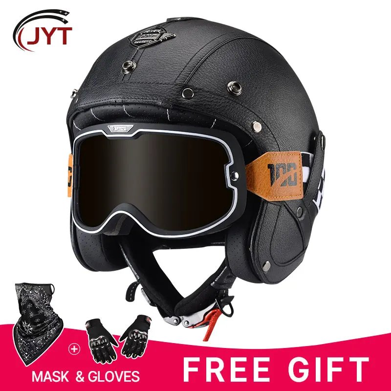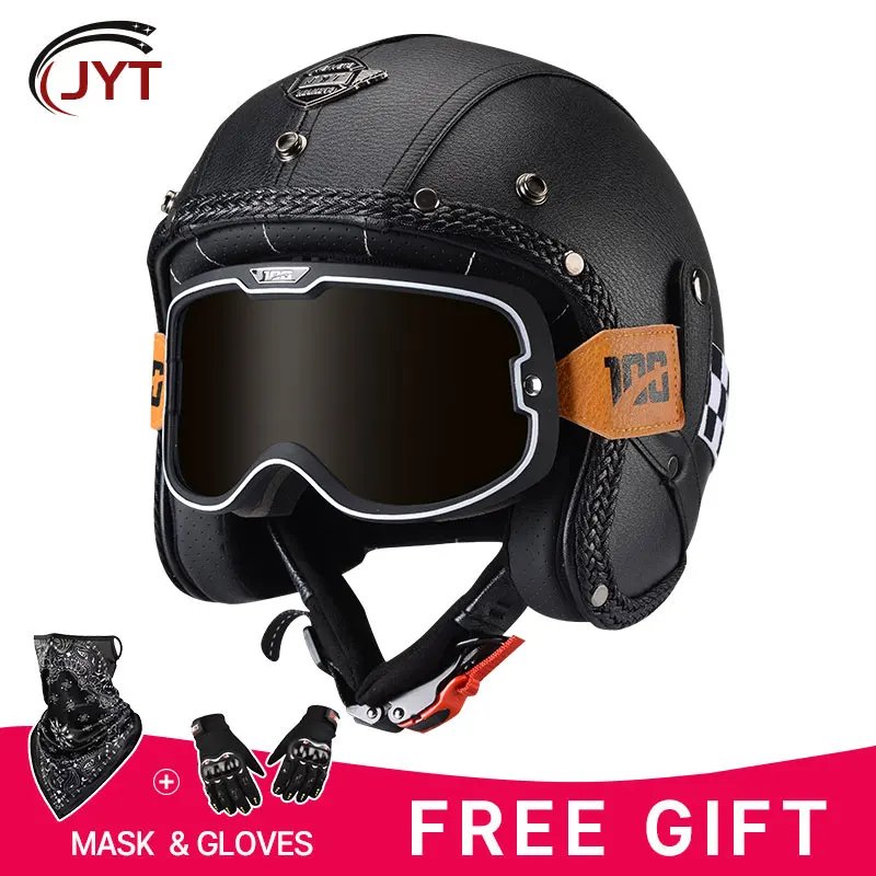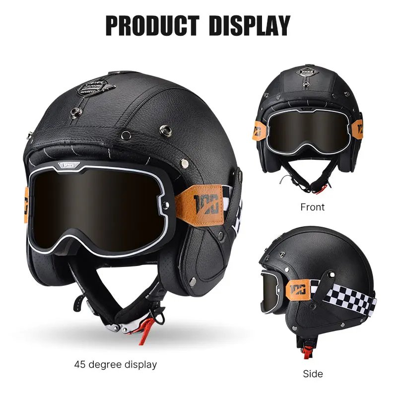 Open Face Helmet German Style Retro 3/4 Half Open Motorcycle Helmets with Goggles Men Leather Shell Safty Cap DOT