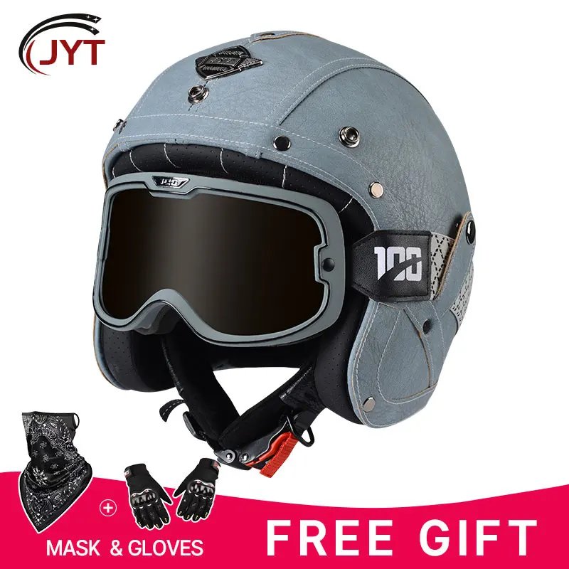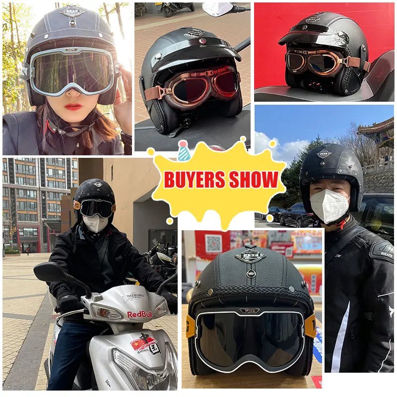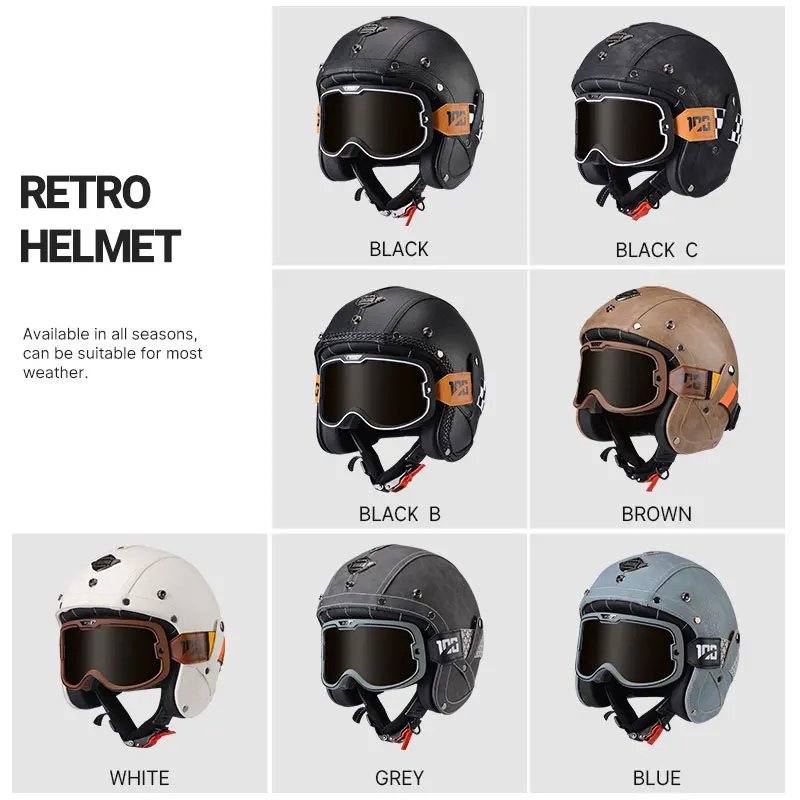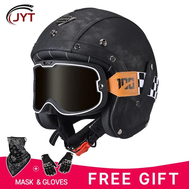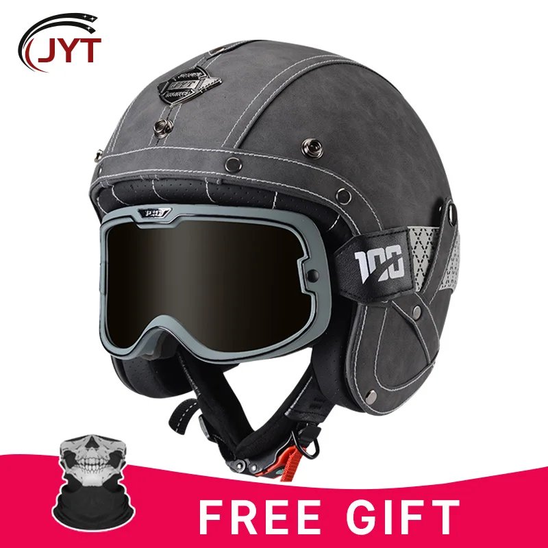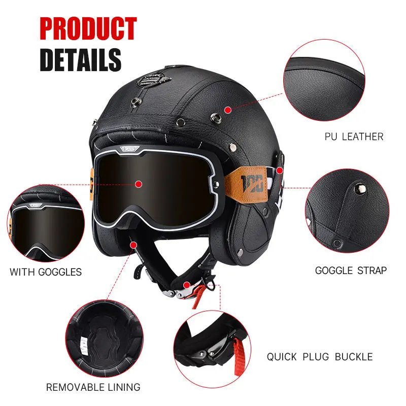 Open Face Helmet German Style Retro 3/4 Half Open Motorcycle Helmets with Goggles Men Leather Shell Safty Cap DOT