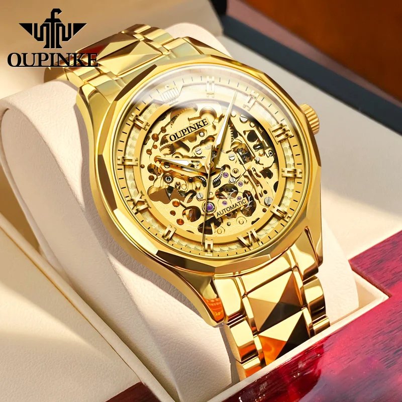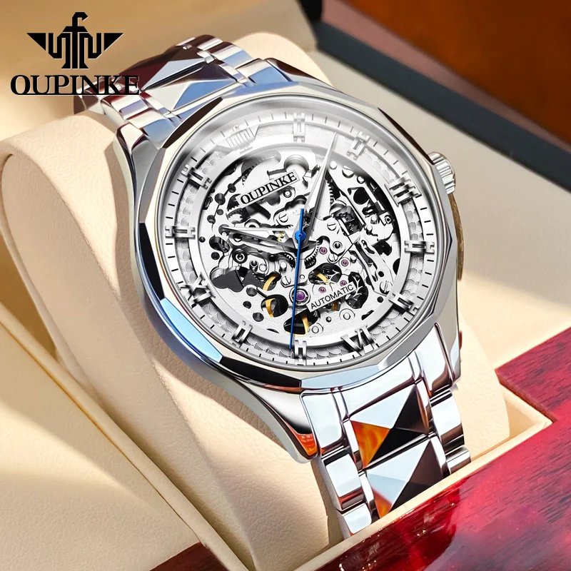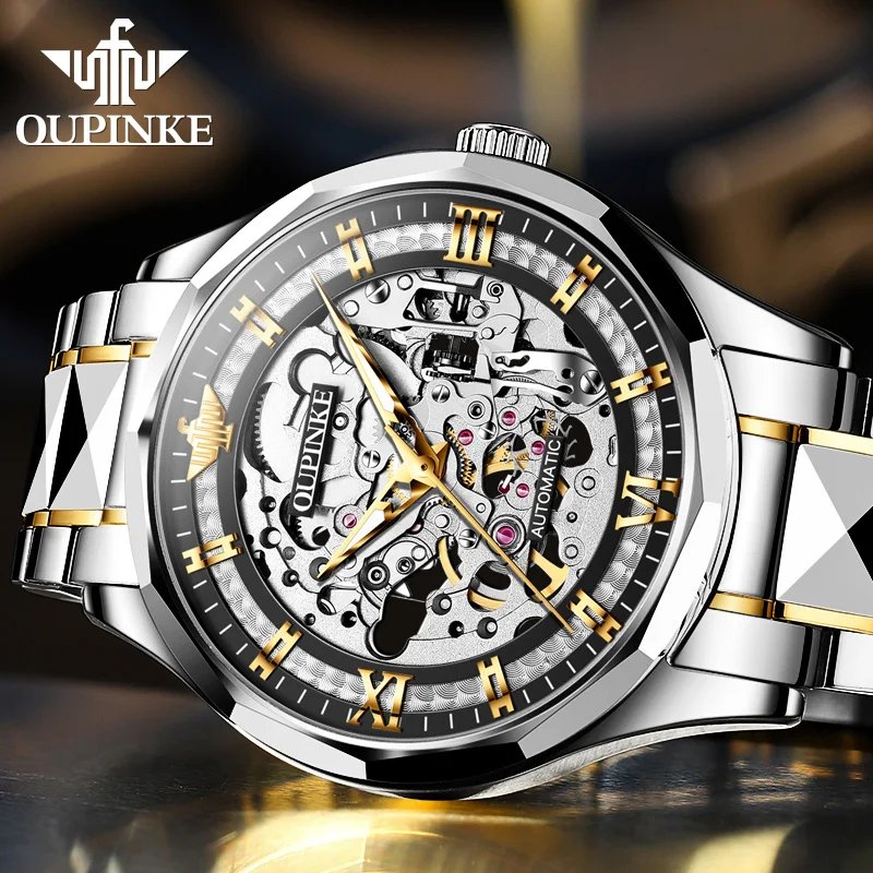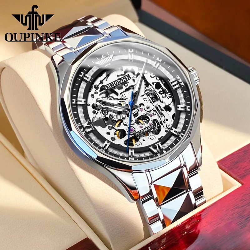 OUPINKE Skeleton Automatic Mechanical Watch for Men Tungsten Steel Waterproof
