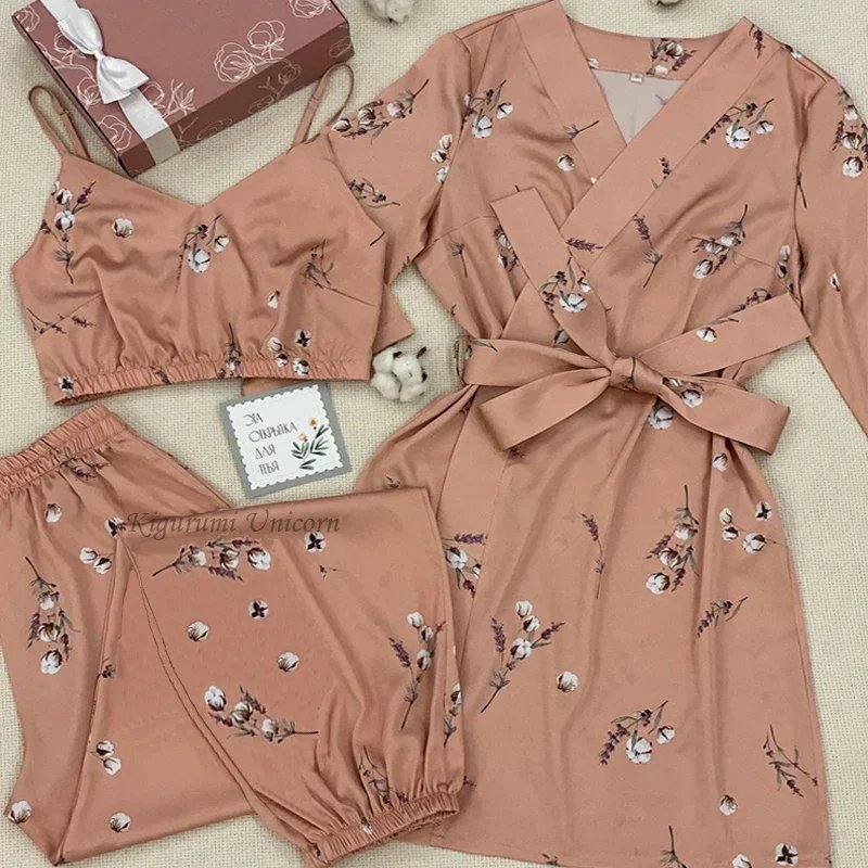 Satin Faux Silk Pajamas Set Women Strap Top Pants Floral Printed Sleepwear Autumn Pyjamas Home Wear Nightwear Robe Gown S-XXL