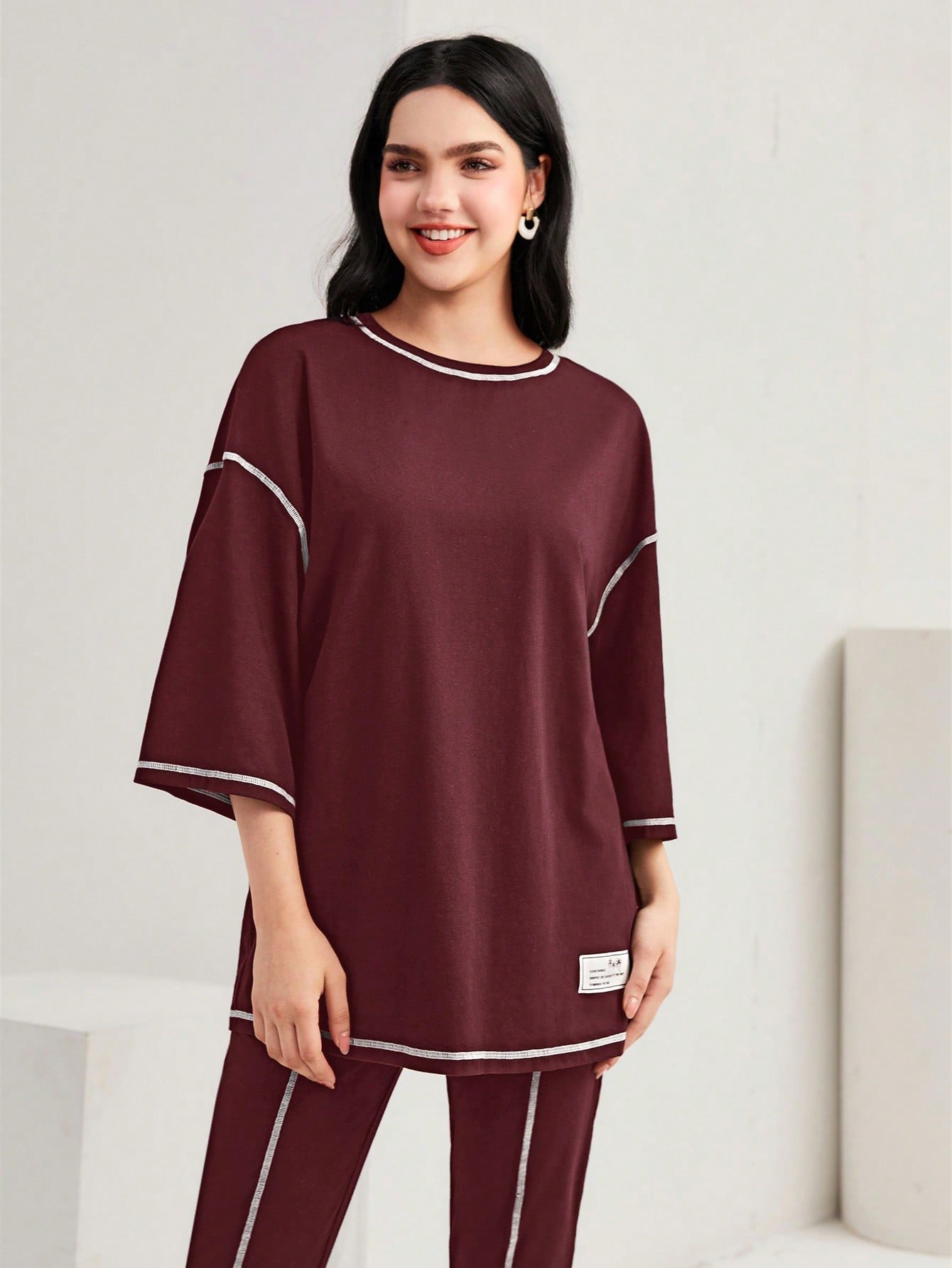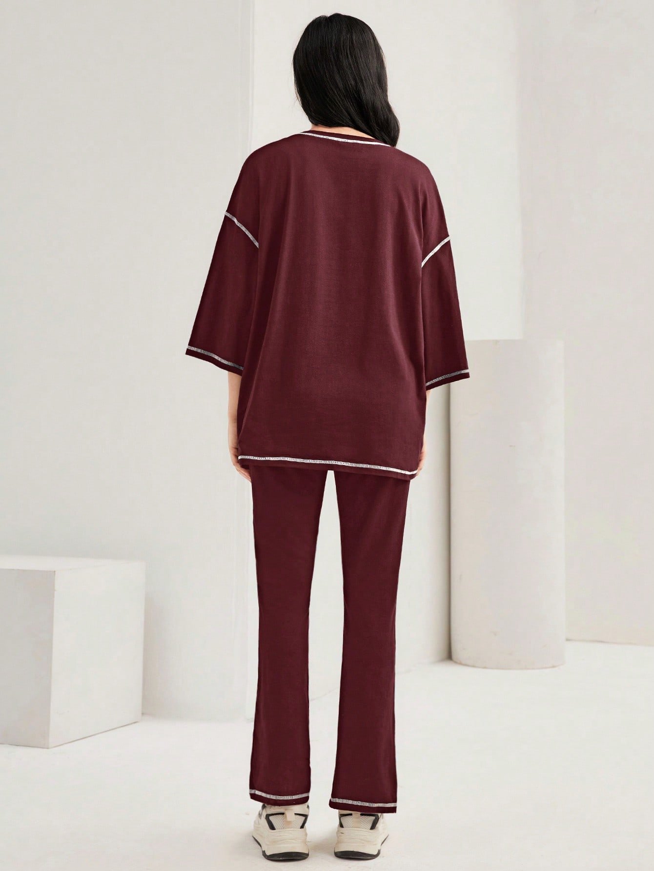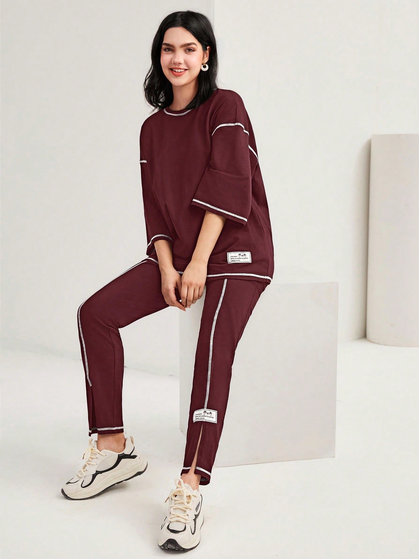 SHEIN Mulvari Burgundy Red Color-Block Drop Shoulder Crew Neck Top And Pants Set 2 Piece Set