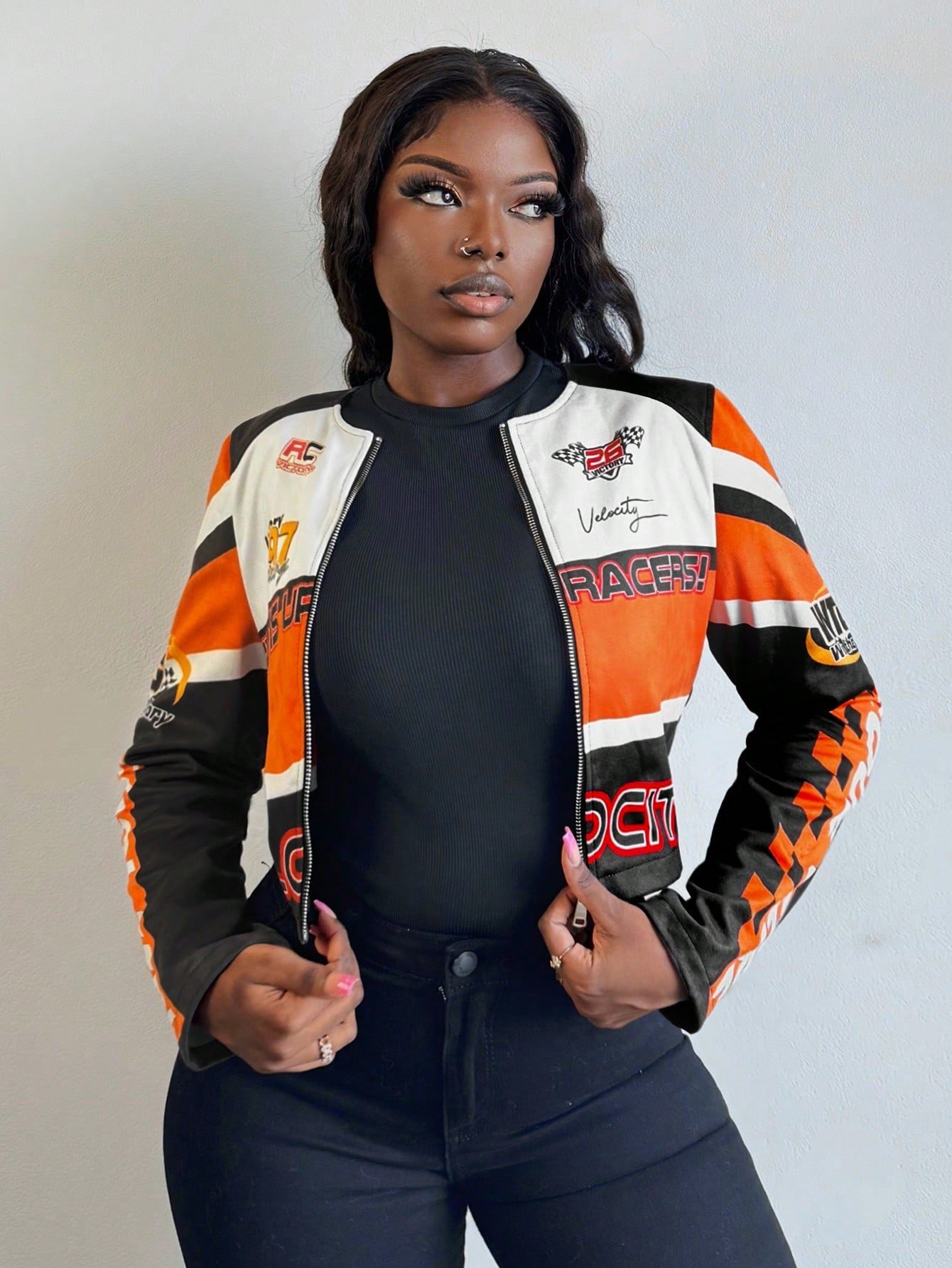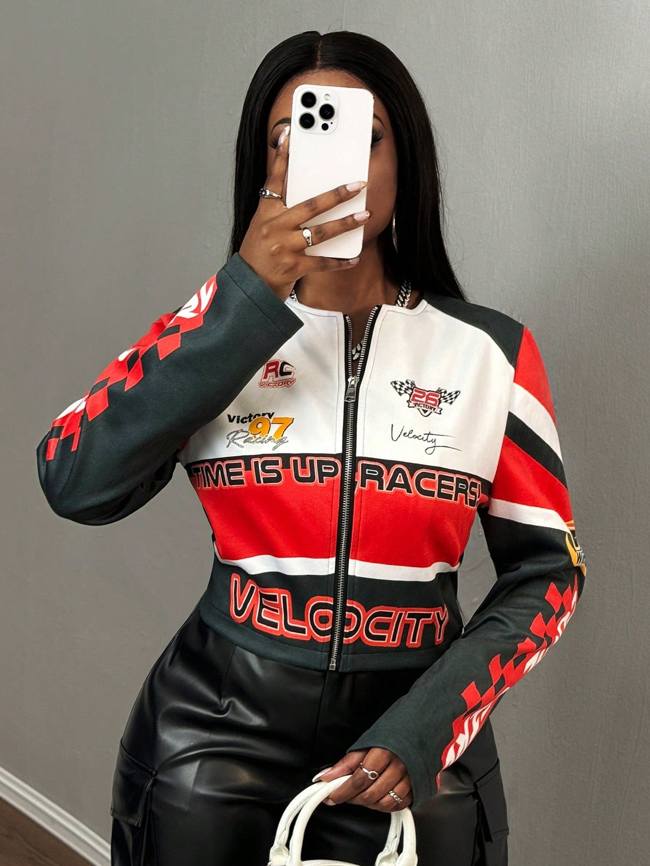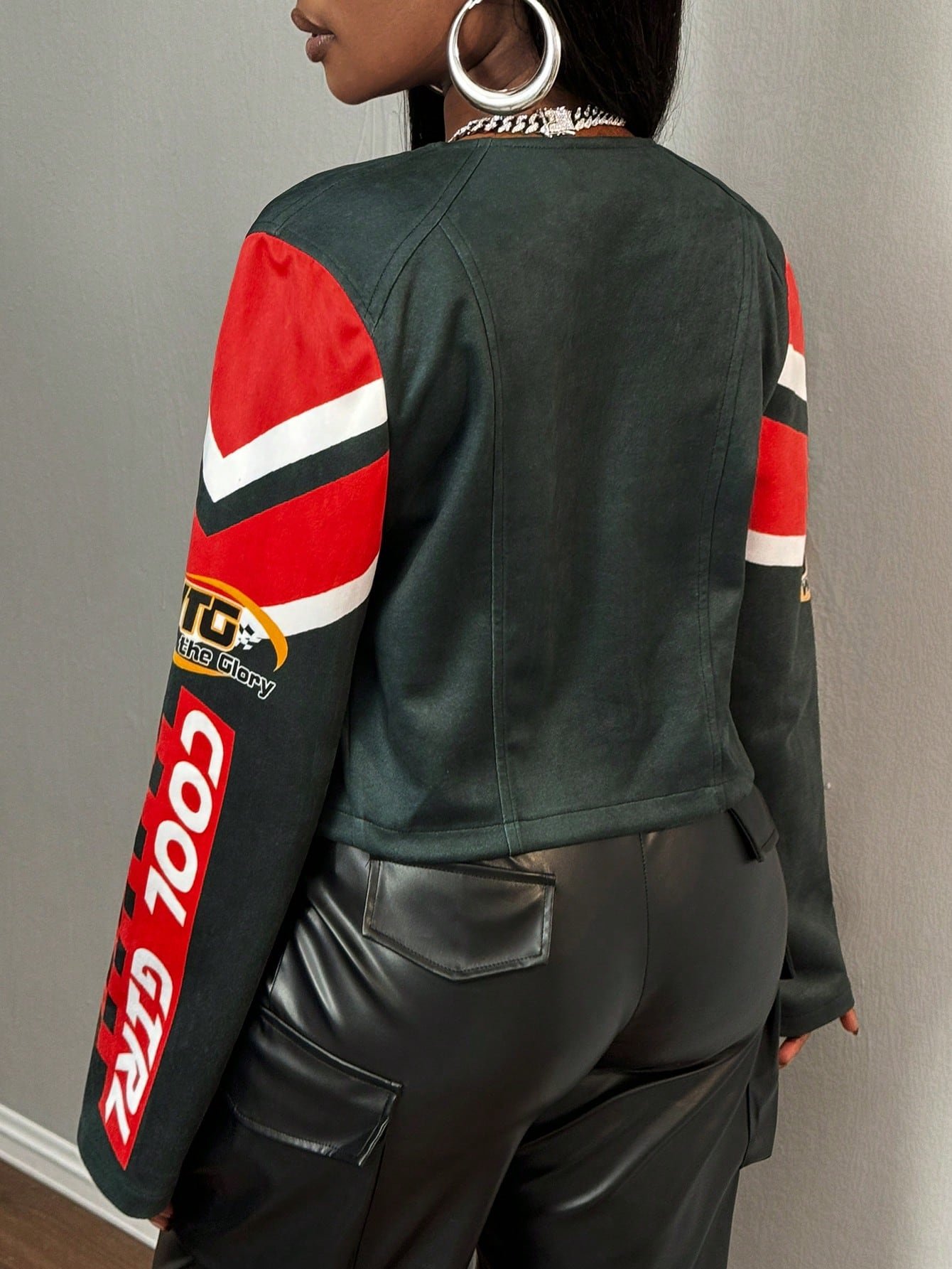 SHEIN Slayr Autumn And Winter Casual Street Motorcycle Contrast Printed Long-Sleeved Truncated PU All-Over Printed Jacket Women's Jacket-H