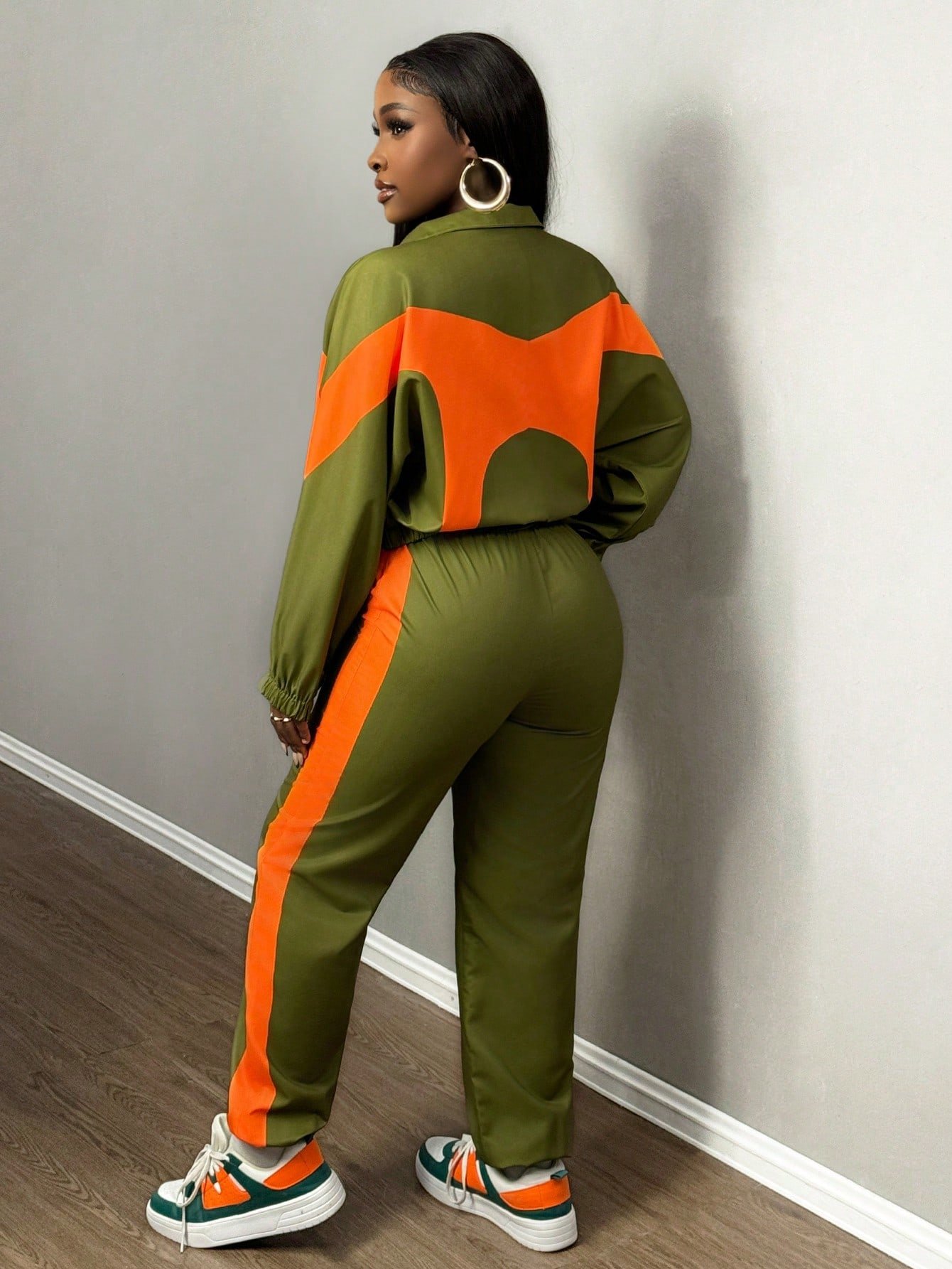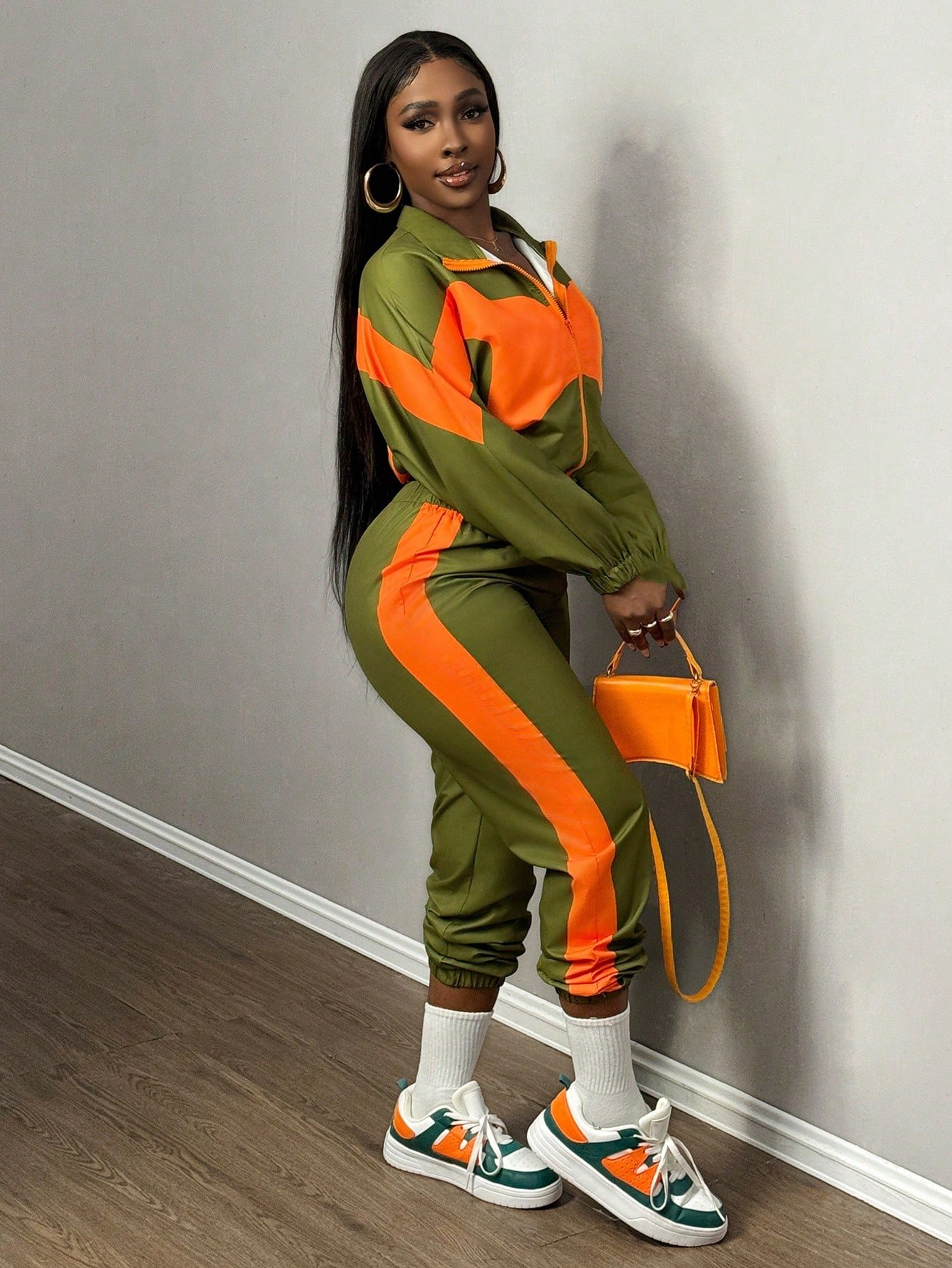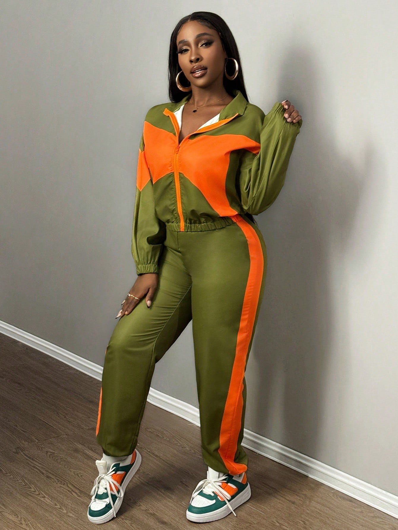 SHEIN Slayr New Casual Sports Lapel + Stand Collar Zipper Loose Top + Leggings Trousers Contrasting Color Women's Two-Piece Set-E