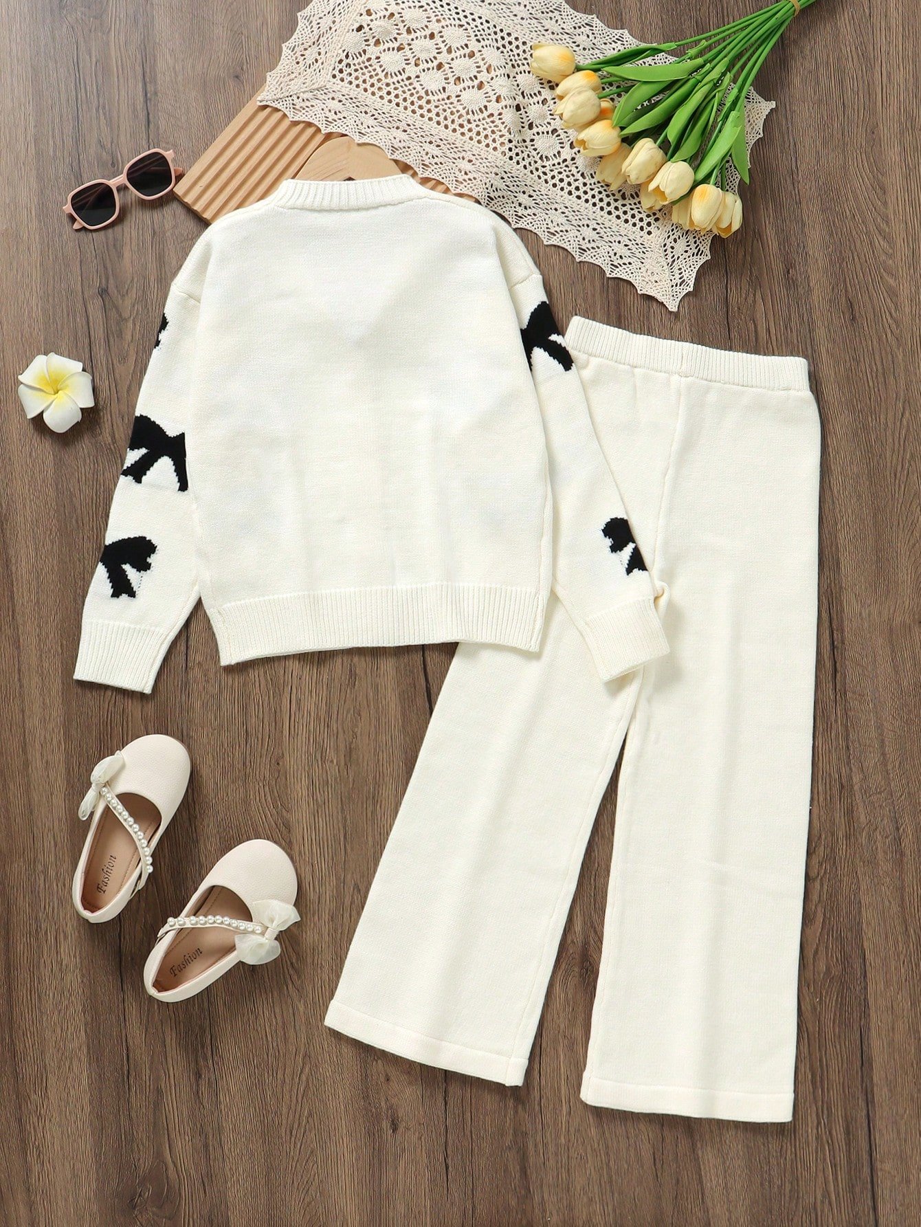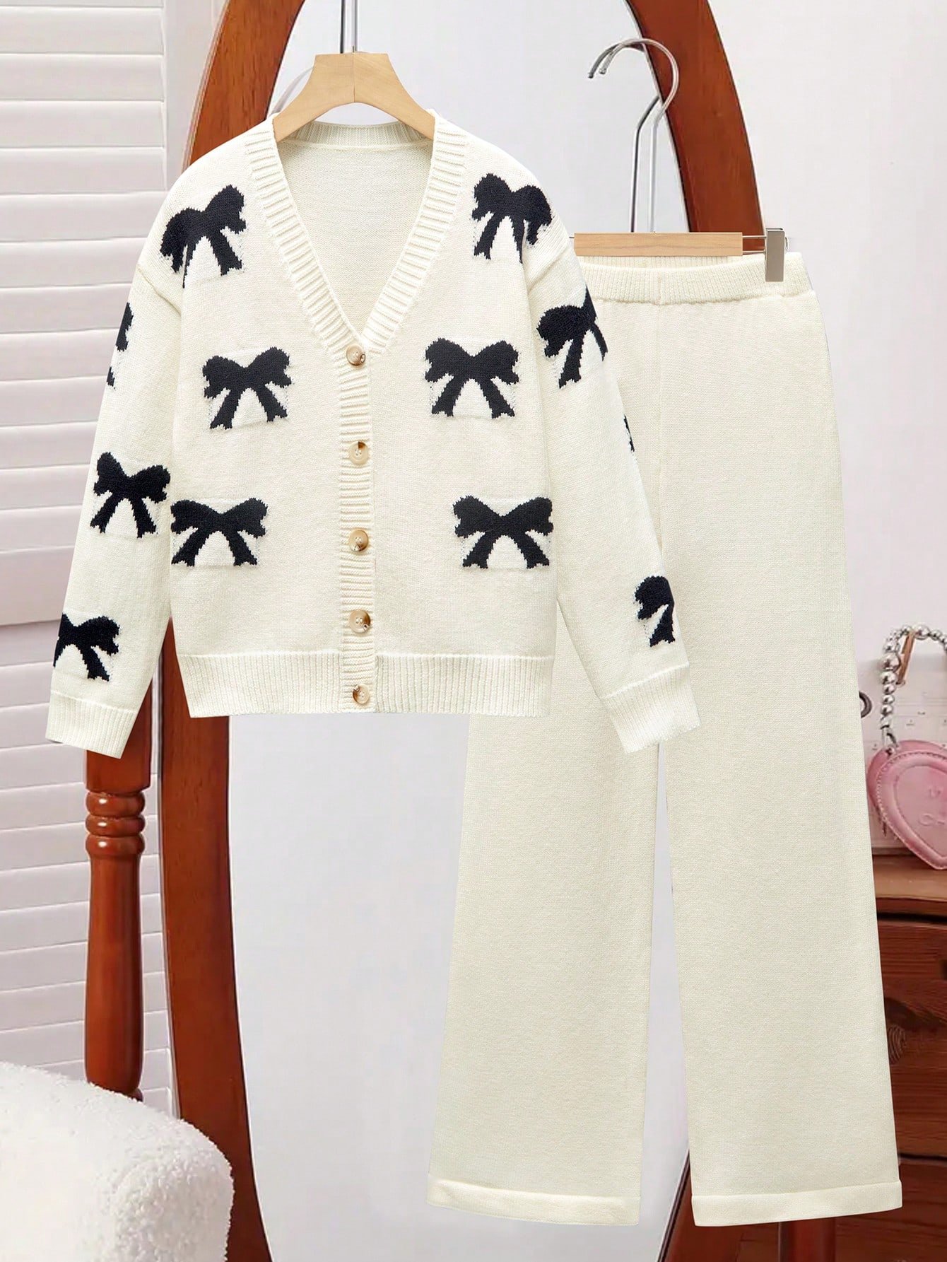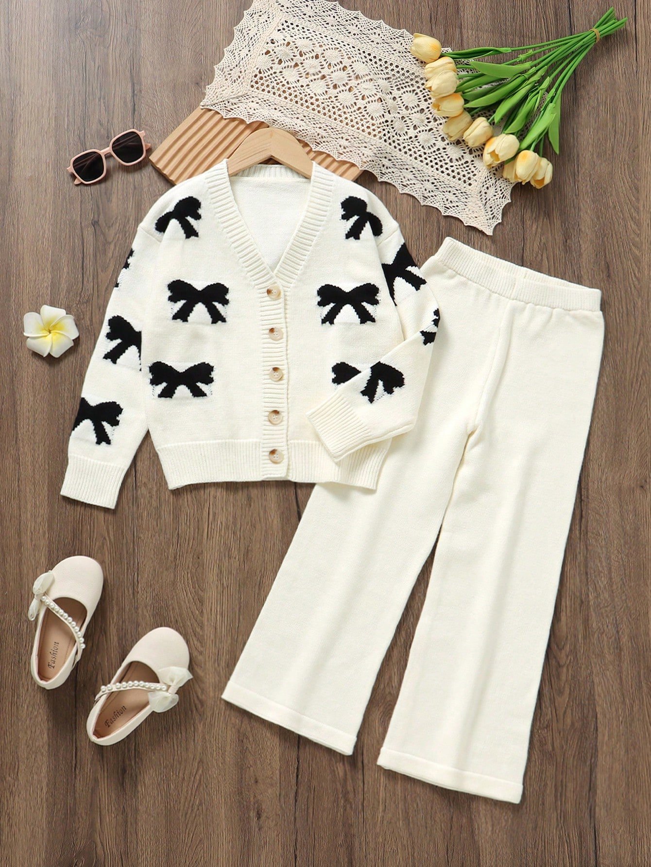 SHEIN Tween Girls Sweater Co-Ord Set – Includes Long Sleeve Knitted V-Neck Cardigan With Bow Design And Matching Knitted Pants, Soft & Comfortable, Suitable For Daily, Outdoor, Travel, Vacation, Home, Nursery, Play, And School Wear