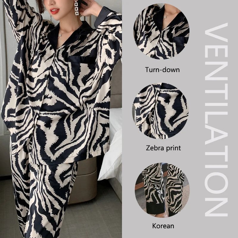Spring and Fall Winter Pajamas Women Zebra Print Long Sleeve Long Pants 2PCS Set Home Wear Ladies Silk Comfortable Sleepwear