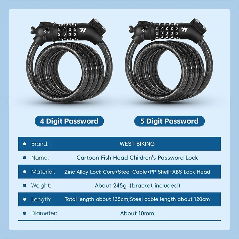 WEST BIKING 1.2M Children’s Password Bicycle Lock Cute Cartoon Fish Anti-theft Waterproof Rustproof Bike Lock Bike Accessories