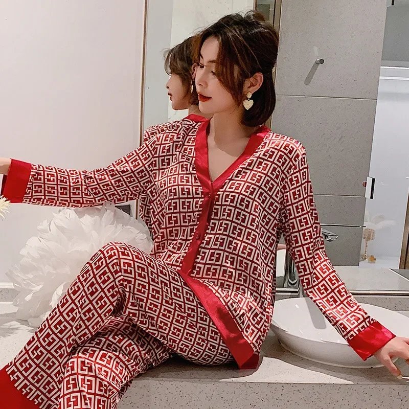 Women's Pajamas Set V Neck Design Luxury Cross Letter Print Sleepwear Silk Like Home Clothes XXL Large Size Nightwear