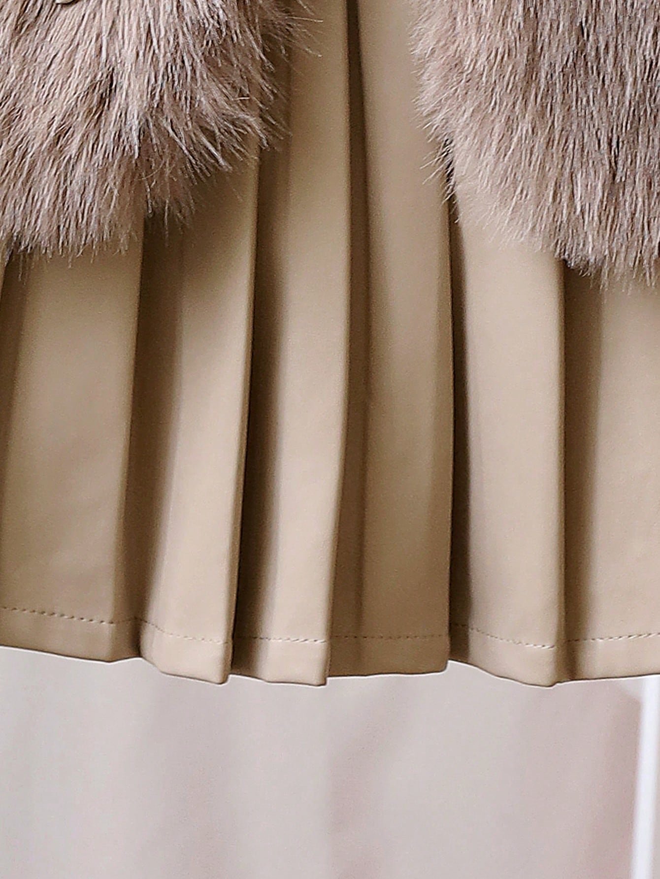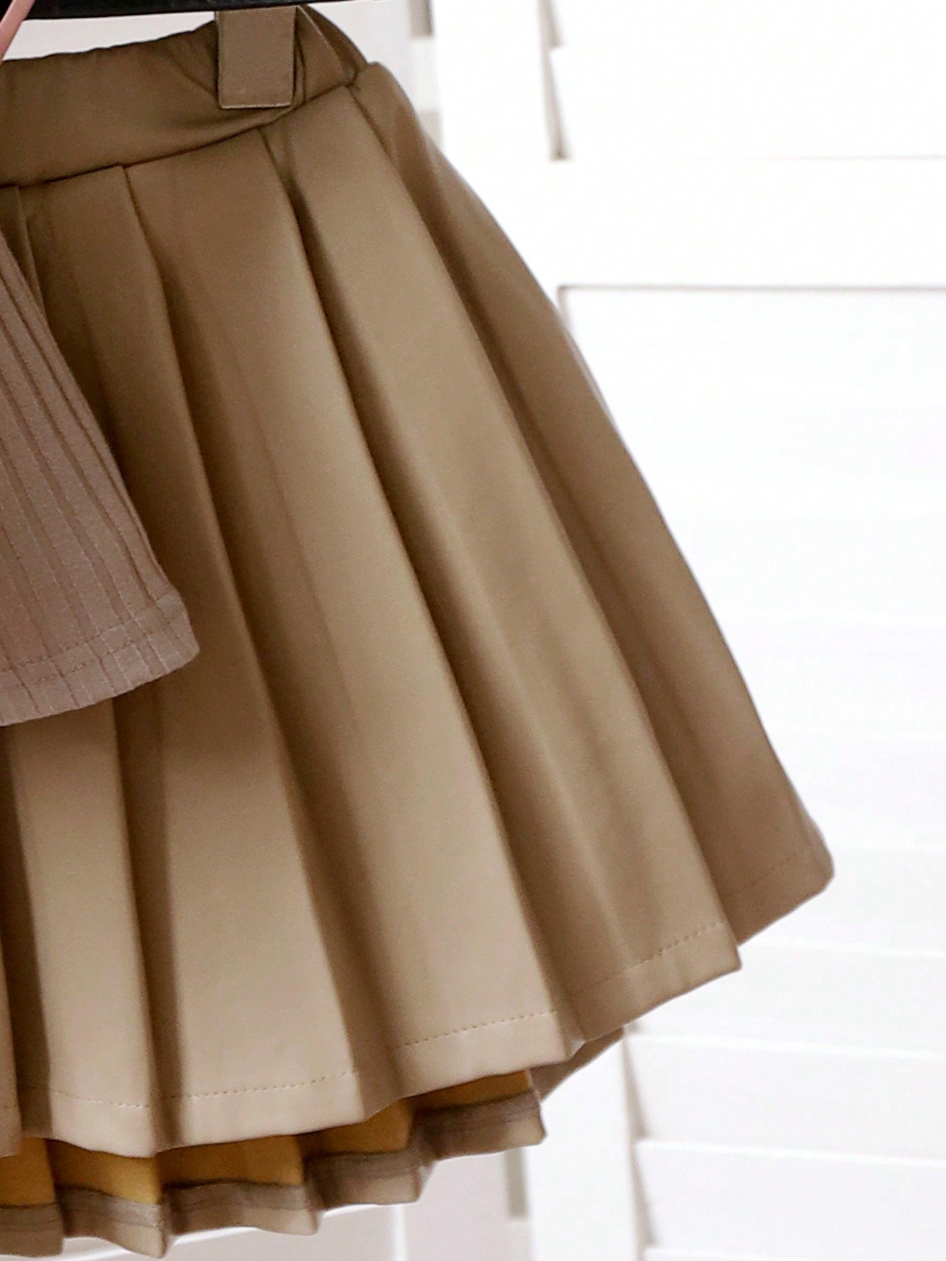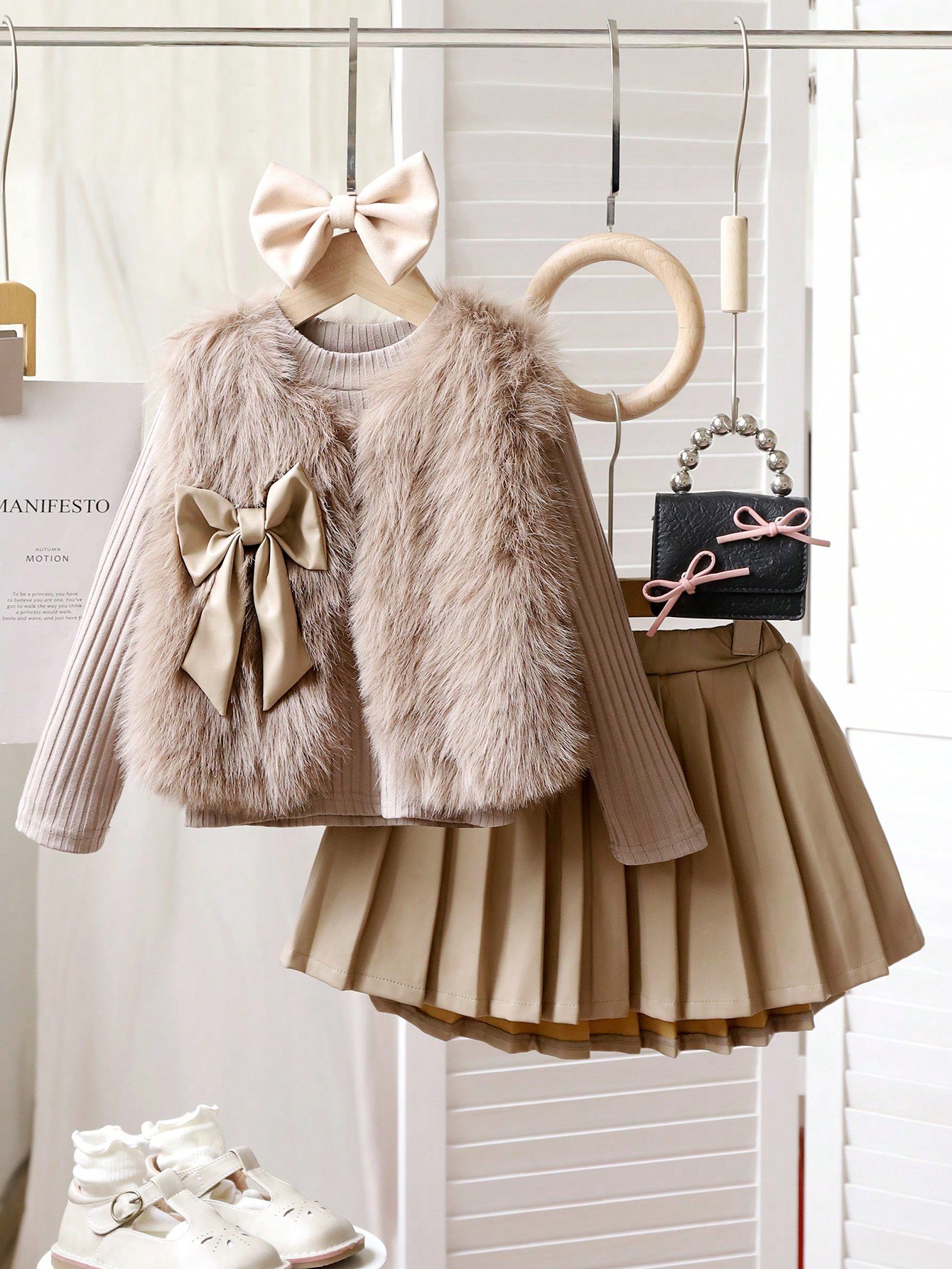 Young Girl 3pcs Fashionable Vest Coat, Long Sleeve Knit Top And Half-Body Leather Skirt Set, Spring & Autumn